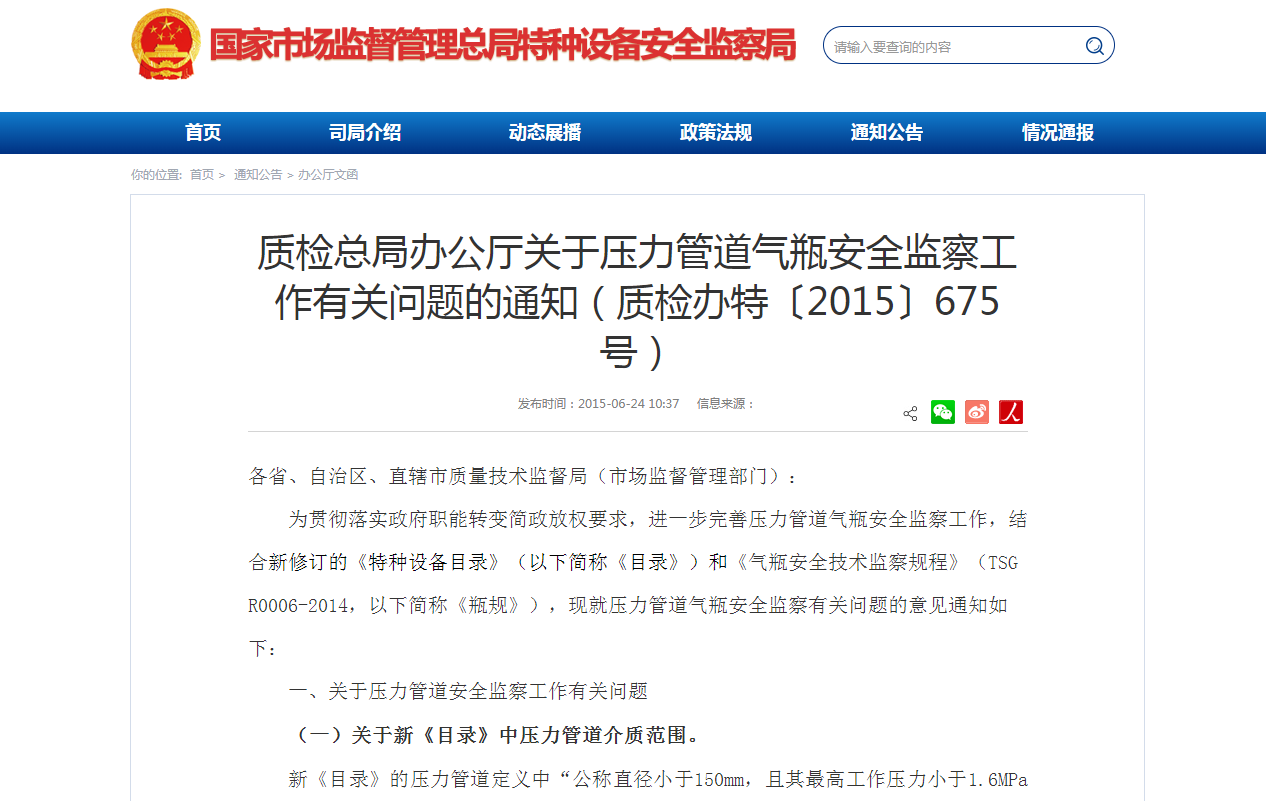 為貫徹落實(shí)政府職能轉(zhuǎn)變簡(jiǎn)政放權(quán)要求,進(jìn)一步完善壓力管道氣瓶安全監(jiān)察工作,結(jié)合新修訂的《特種設(shè)備目錄》(以下簡(jiǎn)稱《目錄》)和《氣瓶安全技術(shù)監(jiān)察規(guī)程》(TSG R0006-2014,以下簡(jiǎn)稱《瓶規(guī)》),現(xiàn)就壓力管道氣瓶安全監(jiān)察有關(guān)問題的意見通知如下: