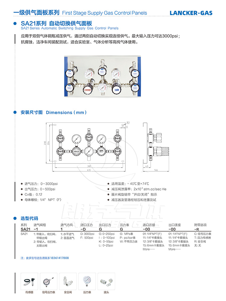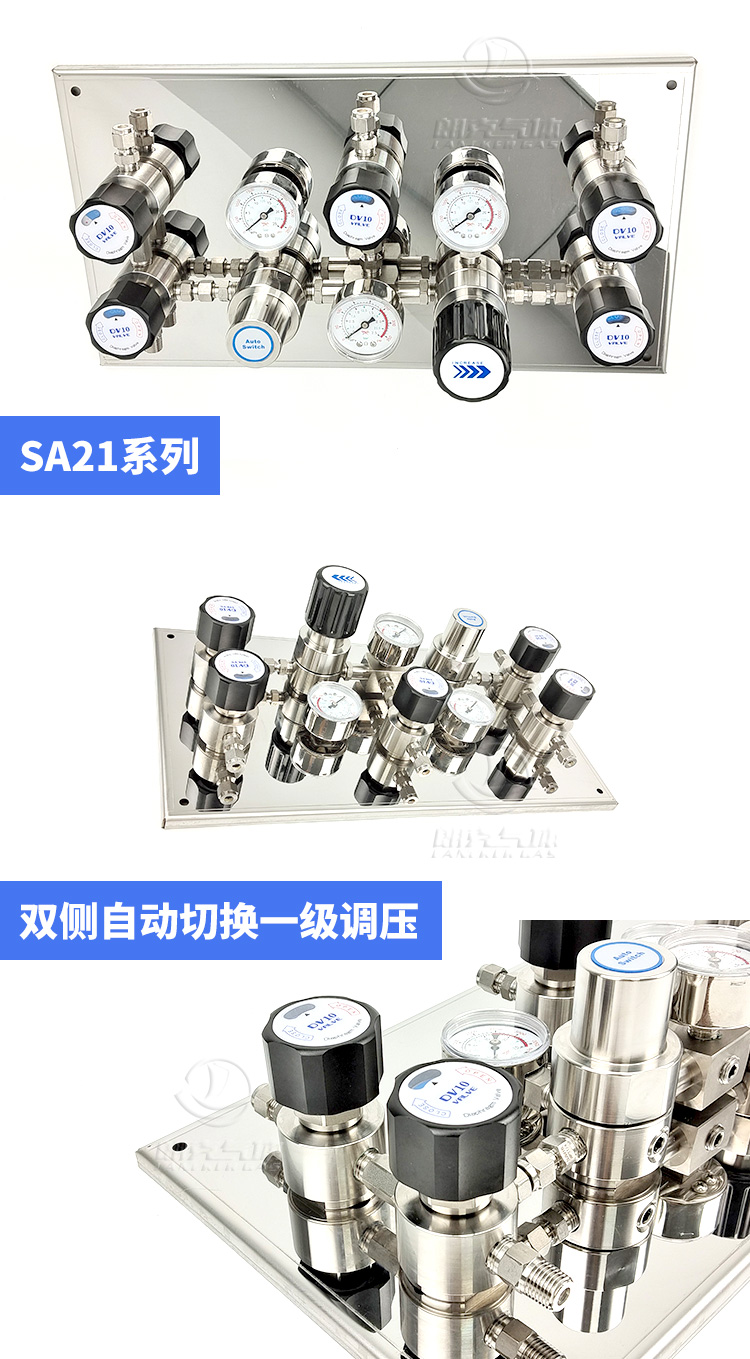 SA21雙級自動切換供氣面板應用于雙側氣體鋼瓶減壓供氣,通過兩側自動切換實現(xiàn)連續(xù)供氣。最大輸入壓力可達3000psi;