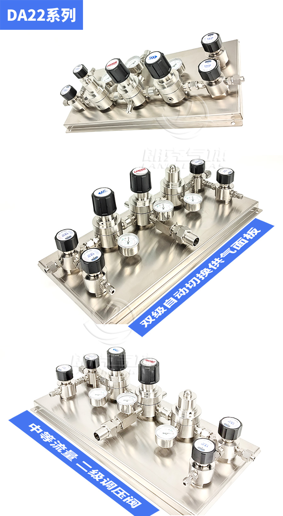 DA22雙級(jí)自動(dòng)切換一級(jí)供氣面板應(yīng)用于雙側(cè)氣體鋼瓶減壓供氣,通過(guò)兩側(cè)自動(dòng)切換實(shí)現(xiàn)連續(xù)供氣。最大輸入壓力可達(dá)3000psi;