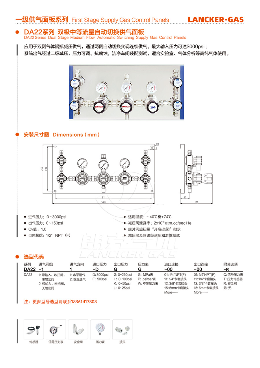 DA21雙級(jí)自動(dòng)切換供氣面板應(yīng)用于雙側(cè)氣體鋼瓶減壓供氣,通過(guò)兩側(cè)自動(dòng)切換實(shí)現(xiàn)連續(xù)供氣。最大輸入壓力可達(dá)3000psi;系統(tǒng)出氣經(jīng)過(guò)二級(jí)減壓,壓力可調(diào)??垢g,潔凈車間裝配測(cè)試,適合實(shí)驗(yàn)室、氣體分析等高...
